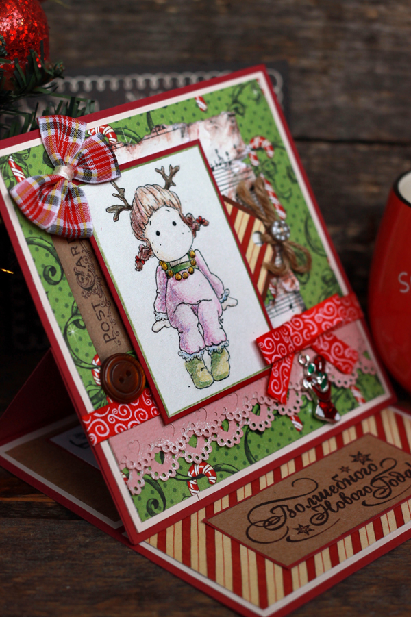 Основное внимание я уделила открыткам-мольбертам. Очень удачная форма. Смотрится интересно и одновременно выступает как открыткой, так и новогодним украшением интерьера. И специально для не поклонников писать длинные поздравления - поле для подписи небольшое)